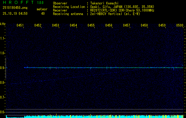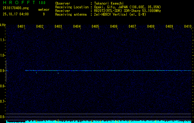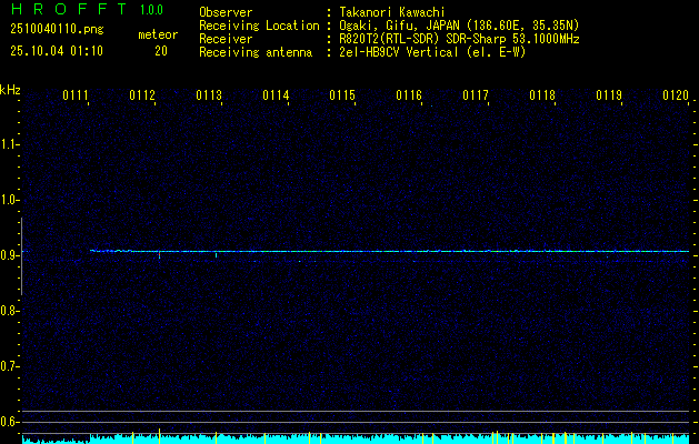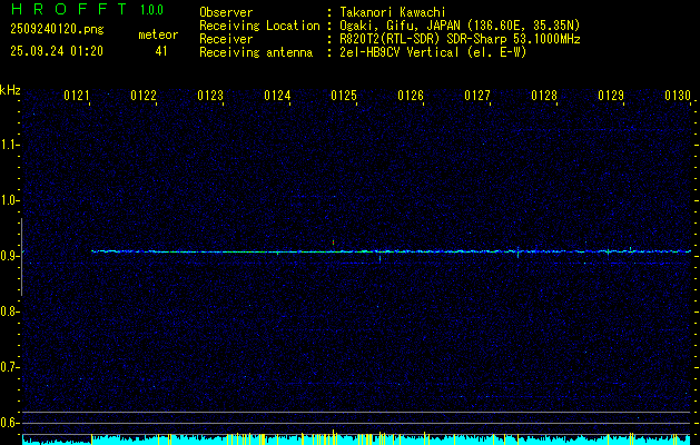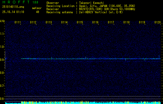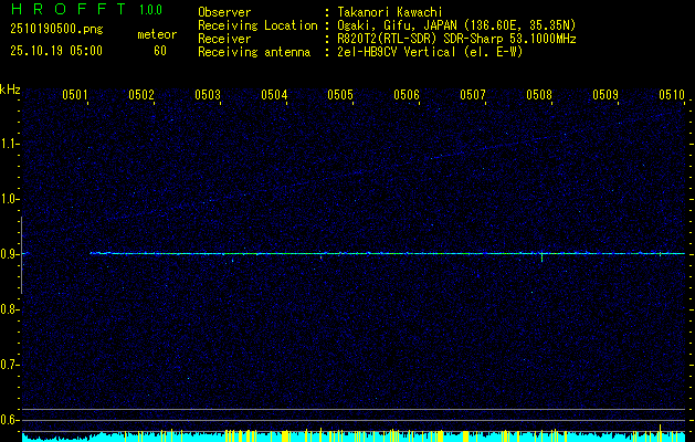 送信波は1分OFF/9分ONの繰り返しです.横一線の信号は送信局からの直接波です.
